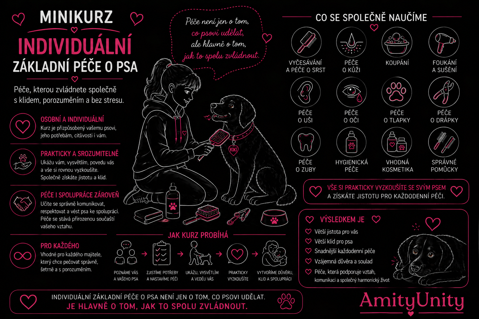 Pomůže vám, pokud si nejste jistí, jak správně pečovat o srst, kůži, uši nebo drápky, pokud váš pes péči nemá rád, stresuje se nebo spolupráce při manipulaci není jednoduchá. Stejně tak je vhodný i pro ty, kteří chtějí péči nastavit správně hned od začátku.